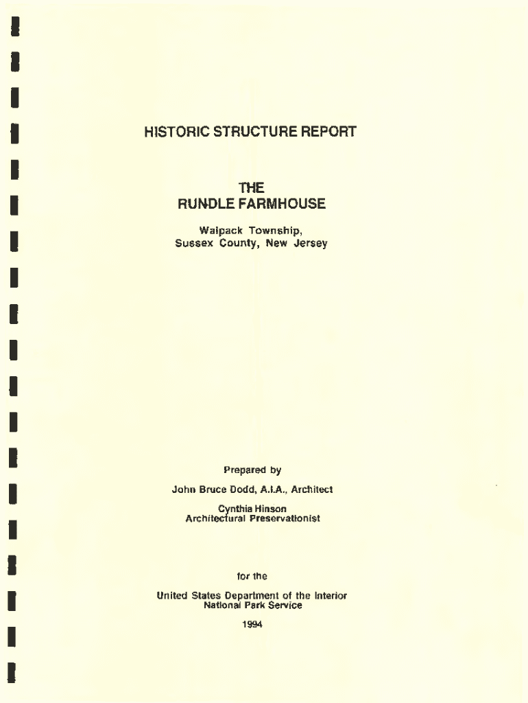 This report provides a detailed historical and architectural analysis of the Rundle House located in Walpack Township, Sussex County, New Jersey. It includes historical data regarding the upper Delaware Valley, the history of Walpack Township, and the specific history of the Rundle House. The report also documents the architectural features of the structure and its outbuildings, examines the structural conditions and materials, and offers recommendations for preservation and use, ensuring...