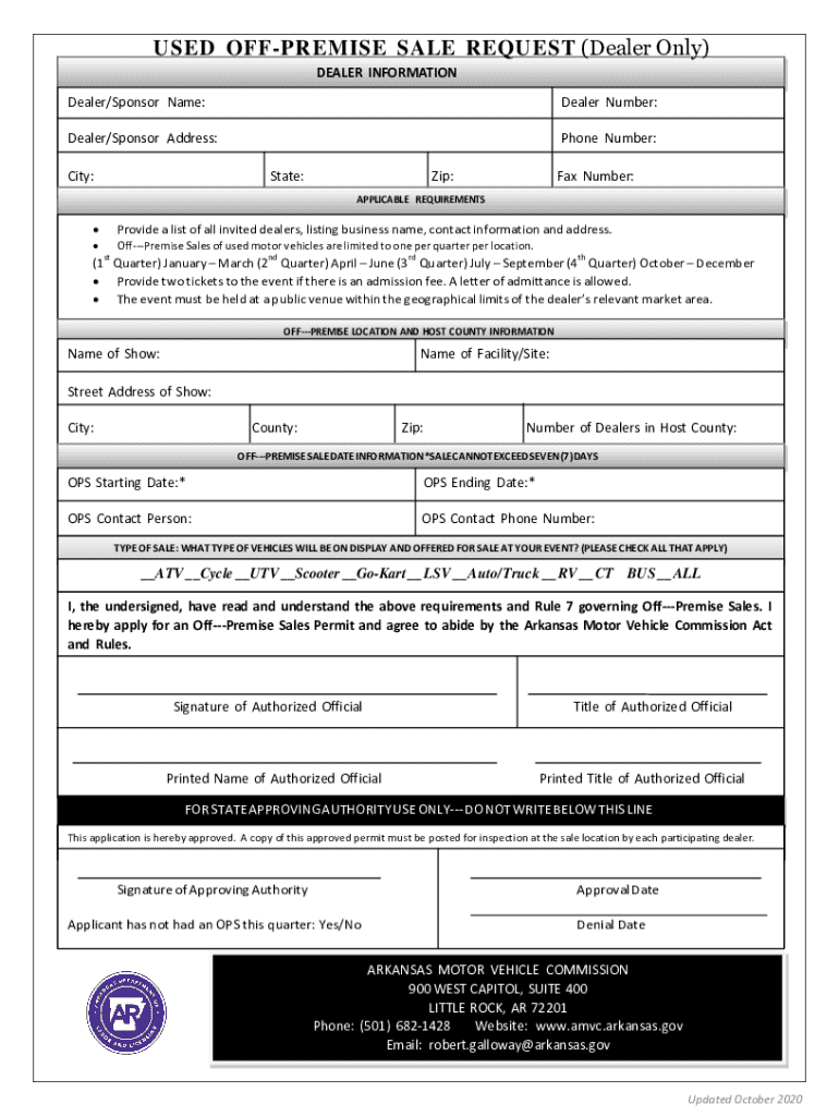 This document serves as a request form for dealers to obtain permission to conduct off-premise sales of used motor vehicles. It outlines the necessary dealer information, event requirements, sale date information, and vehicle types that can be presented for sale. The request must comply with the Arkansas Motor Vehicle Commission regulations.