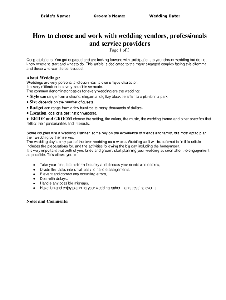 Bride\'s Name:___Groom\'s Name:___Wedding Date:___How to choose and work with wedding vendors, professionals and service providers Page 1 of 3 Congratulations! You got engaged and are looking forward