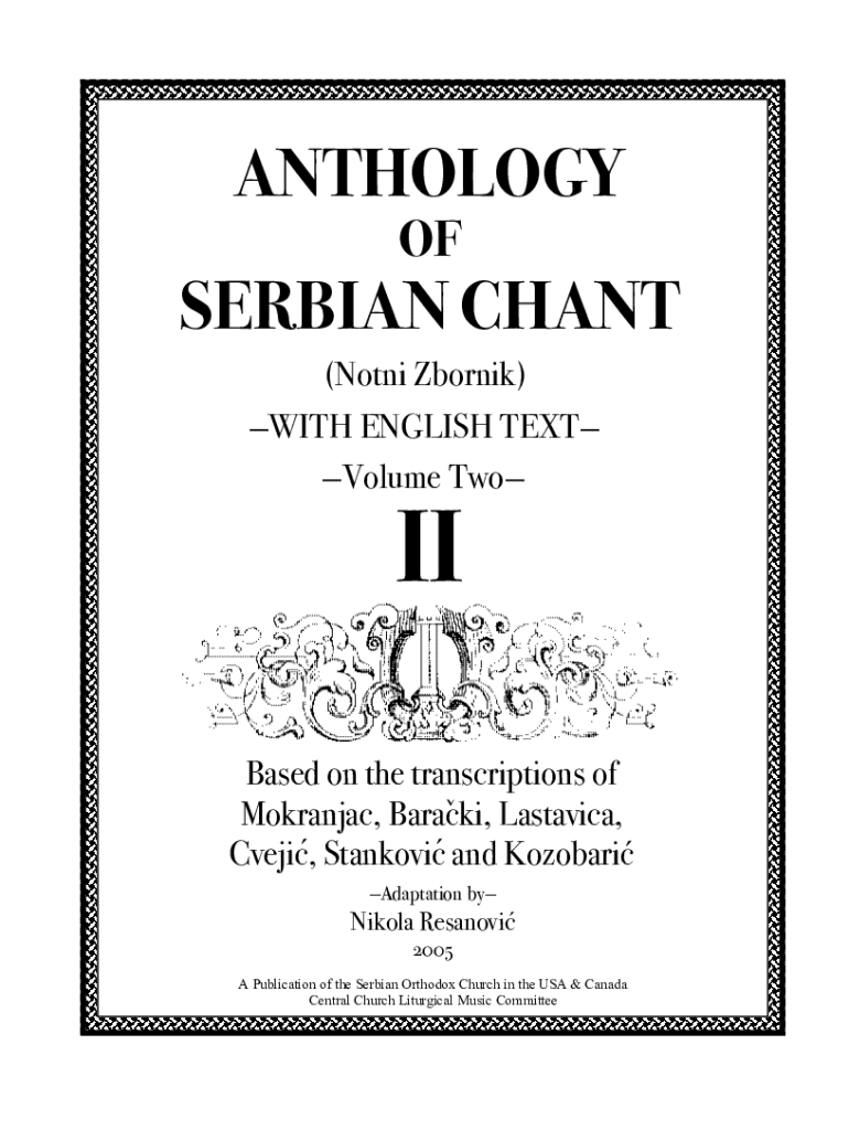 ANTHOLOGY OFSERBIAN CHANT (Notni Zbornik) WITH ENGLISH TEXT Volume TwoIIBased on the transcriptions of Lastavica, Mokranjac, Baracki, Stankovic and Kozobaric Cvejic, Adaptation byNikola Resanovic