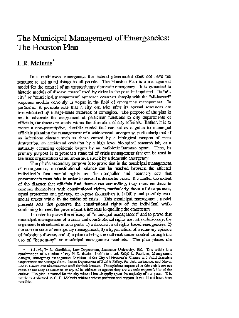 The Houston Plan is a comprehensive management model designed for the control of extraordinary domestic emergencies, particularly large-scale outbreaks of contagion. It emphasizes a flexible, non-prescriptive approach to municipal management that prioritizes the preservation of constitutional rights while addressing the need for effective emergency response. The plan is centered around a \'bottom-up\' management strategy that encourages citizen involvement and aims to balance individual...