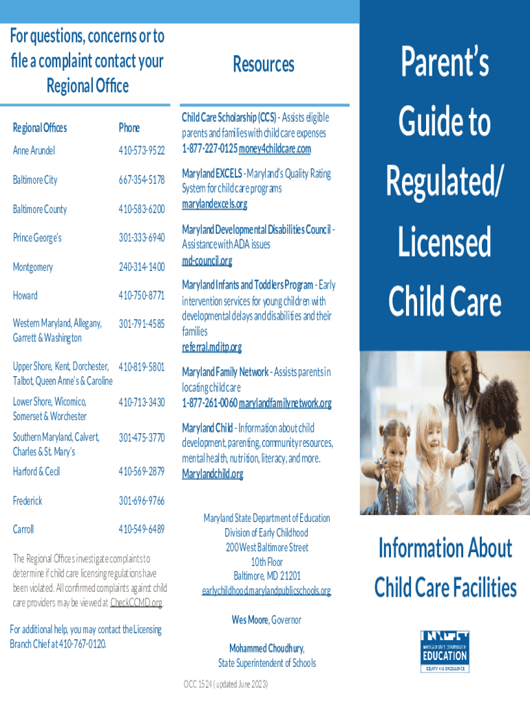 This document provides information about the regulation of child care facilities in Maryland, outlining types of child care programs, licensing requirements, and resources for parents and families. It includes contact information for regional offices, complaint procedures, and guidelines for maintaining safe and healthy environments for children.