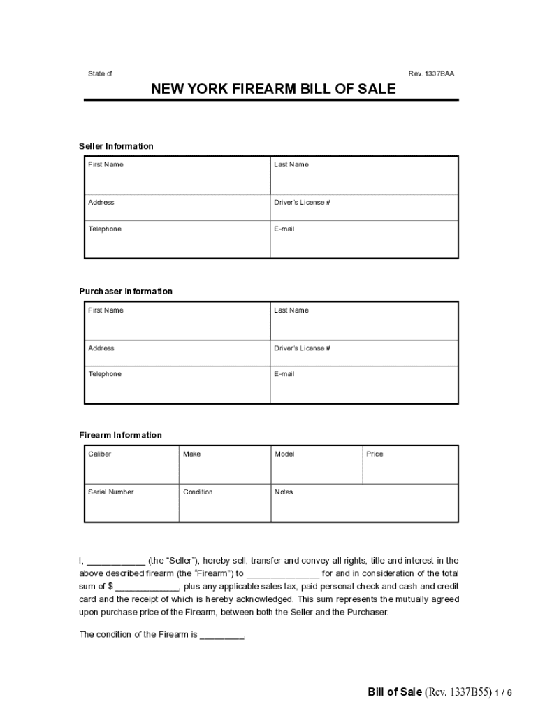 State of ___Rev. 1337BAANEW YORK FIREARM BILL OF SALESeller Information First NameLast NameAddressDrivers License #TelephoneEmailPurchaser Information First NameLast NameAddressDrivers License #TelephoneEmailFirearm