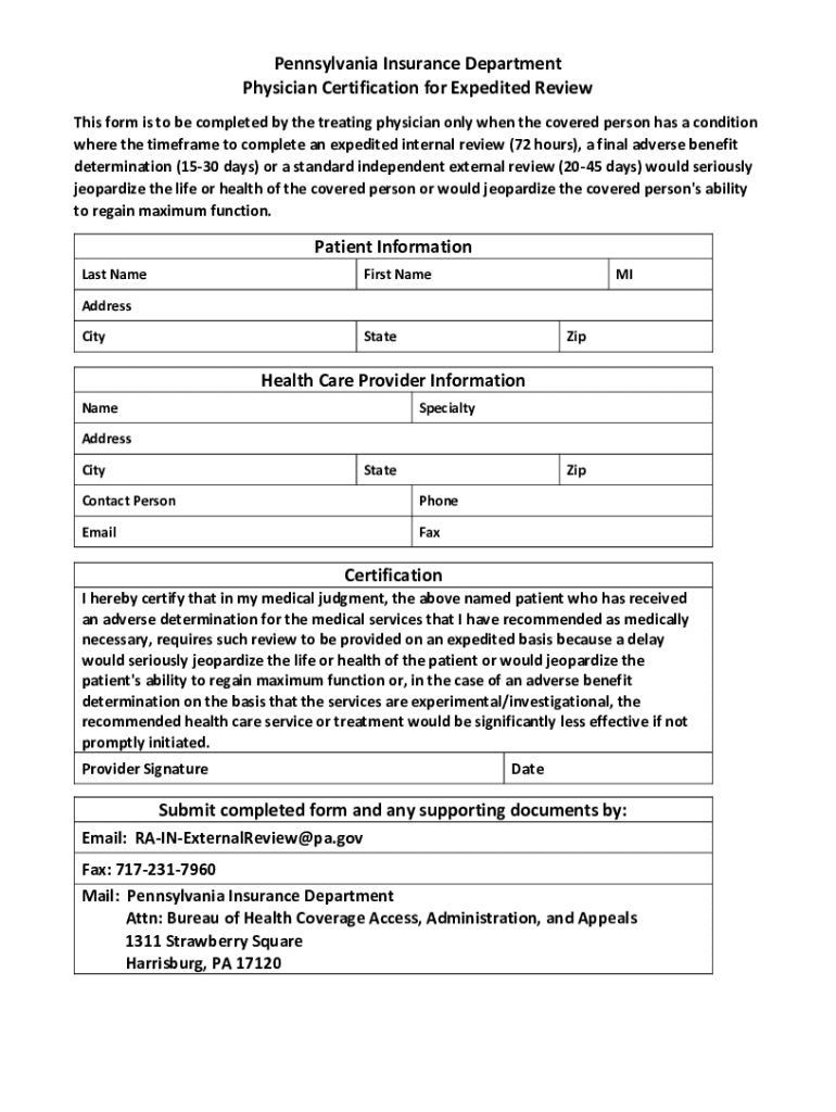 Get the free Physician Certification for Expedited Review