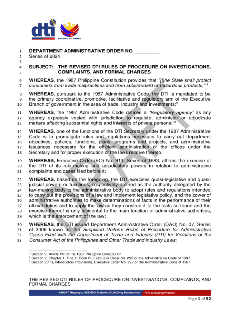 This document provides the revised rules and procedures governing investigations, complaints, and formal charges related to violations of the Consumer Act and other Trade and Industry Laws in the Philippines. It outlines the roles and responsibilities of the Department of Trade and Industry (DTI), including the adjudication process, mediation procedures, and the jurisdiction of the DTI. The order aims to streamline and facilitate the resolution of consumer complaints and administrative cases...