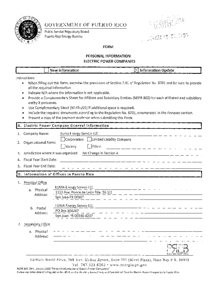 GOVERNMENT OF PUERTO RICO Public Service Regulatory Board PuertoRicoEnergyBureau IIJ1Y1IPERSONAL INFORMATION ELECTRIC POWER COMPANIESILI New InformationInformation UpdateInstructions: When filling