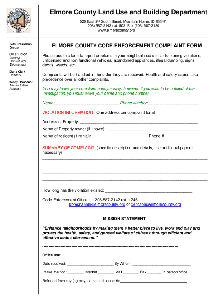 Elmore County Land Use and Building Department 520 East 2nd South Street, Mountain Home, ID 83647 (208) 5872142 ext. 502 Fax (208) 5872120 www.elmorecounty.orgBeth Bresnahan Director Clint Ericson