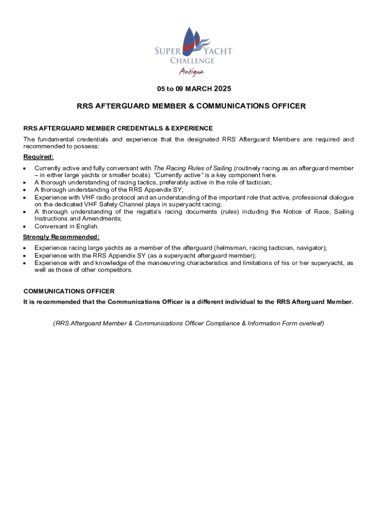 05 to 09 MARCH 2025RRS AFTERGUARD MEMBER & COMMUNICATIONS OFFICER RRS AFTERGUARD MEMBER CREDENTIALS & EXPERIENCE The fundamental credentials and experience that the designated RRS Afterguard Members