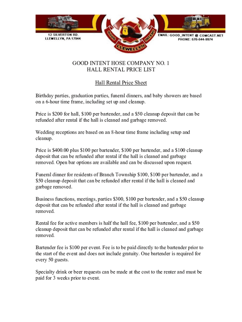This document outlines the rental prices, terms, and conditions for using the hall at Good Intent Hose Company No. 1 for various types of events including parties, receptions, and meetings. It includes details on pricing for different events, bartender fees, cleanup deposits, and special requests.