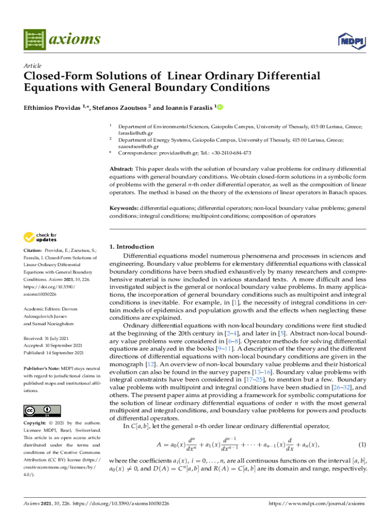axioms ArticleClosedForm Solutions of Linear Ordinary Differential Equations with General Boundary Conditions Efthimios Providas 1, *, Stefanos Zaoutsos 2 and Ioannis Faraslis 1 12*Department of Environmental