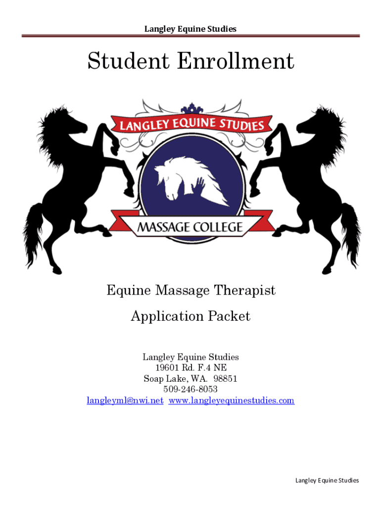 Langley Equine StudiesStudent EnrollmentEquine Massage Therapist Application Packet Langley Equine Studies 19601 Rd. F.4 NE Soap Lake, WA. 98851 5092468053 langleyml@nwi.net www.langleyequinestudies.comLangley