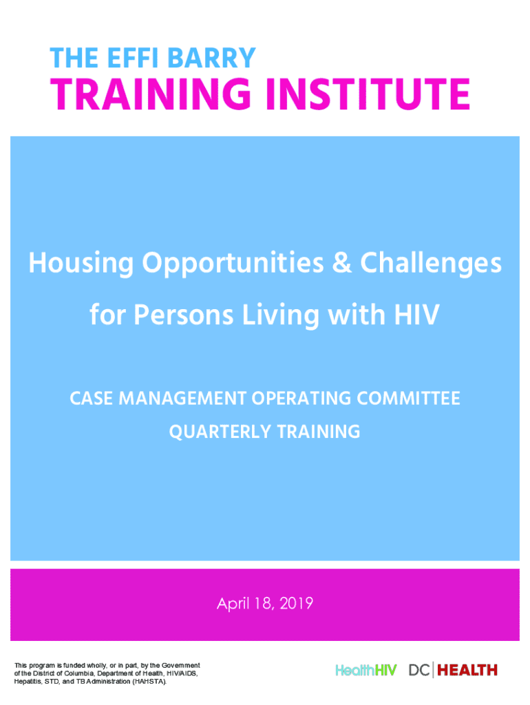 Housing Opportunities & Challenges for Persons Living with HIV CASE MANAGEMENT OPERATING COMMITTEE QUARTERLY TRAININGApril 18, 2019This program is funded wholly, or in part, by the Government of the