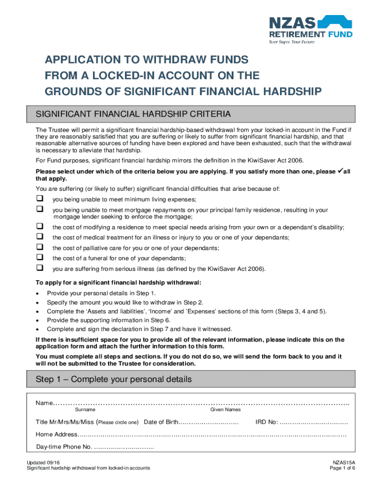 This document is an application form for individuals seeking to withdraw funds from a locked-in account due to significant financial hardship. It outlines the criteria for eligibility, necessary steps to complete the application, and required supporting documentation. The form is guided by the conditions set forth in the KiwiSaver Act 2006.