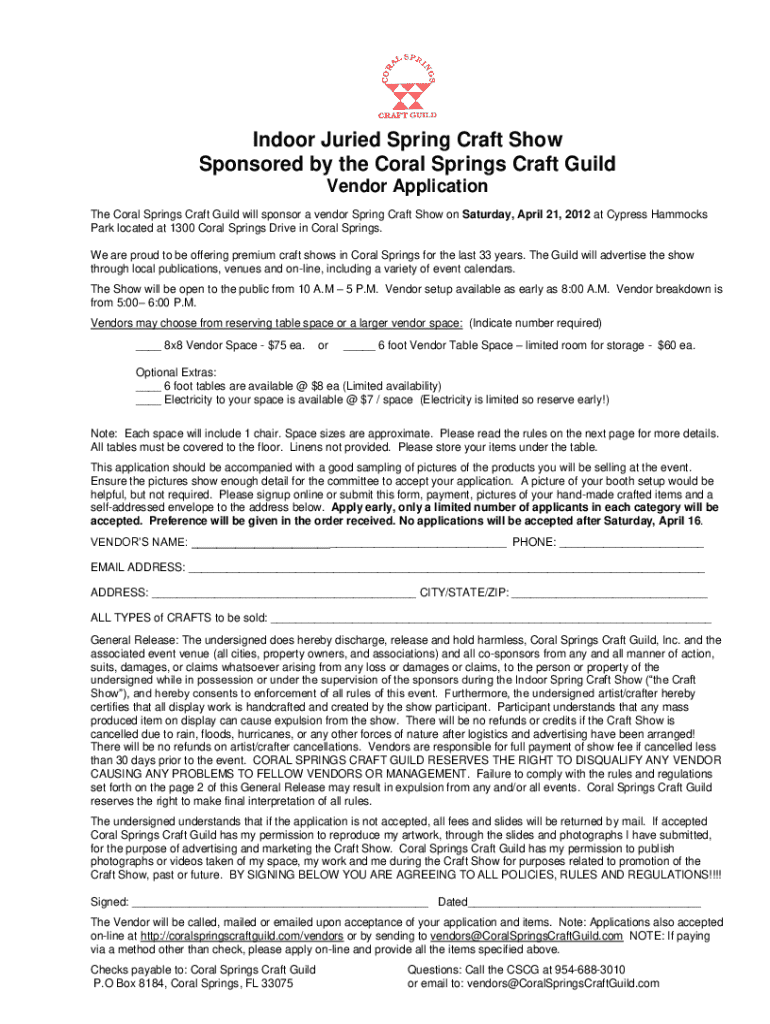 This document serves as an application form for vendors wishing to participate in the Indoor Juried Spring Craft Show sponsored by the Coral Springs Craft Guild. It outlines the event details, vendor requirements, fees, and conditions for participation.