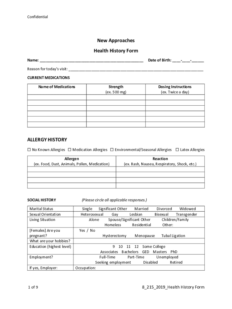 A comprehensive health history form designed to gather detailed medical, social, and family history from patients. This form includes sections on current medications, allergies, social history, medical history, substance abuse history, and mental health, ensuring that healthcare providers have all the necessary information to deliver effective care.