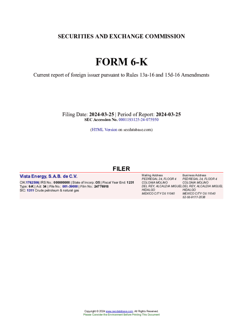 This document is a current report filed by Vista Energy, S.A.B. de C.V. under Form 6-K with the SEC, detailing the company\'s announcement for the release of its consolidated financial statements for the first quarter of 2024, including the timing and access details for the webcast presentation.