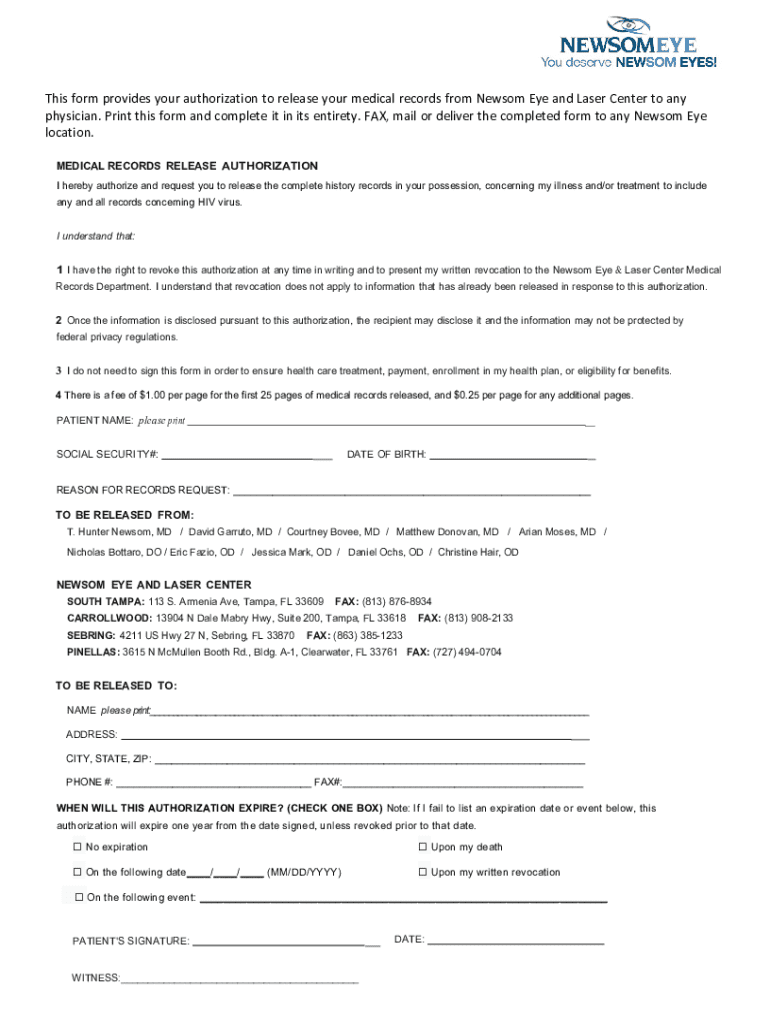 This form authorizes the release of medical records from Newsom Eye and Laser Center to a designated physician and outlines the terms and conditions of the release.