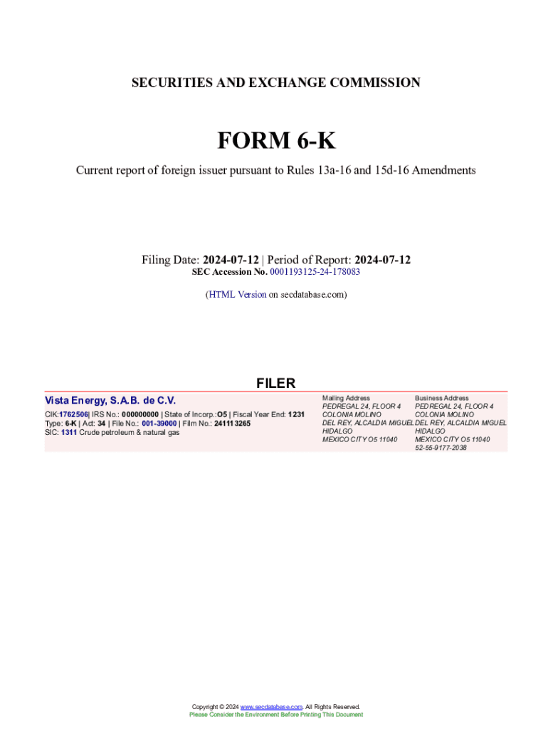 Get the free Vista Energy, S.A.B. de C.V. Form 6-K Current Event Report Filed 2024-07-12. Accessi...