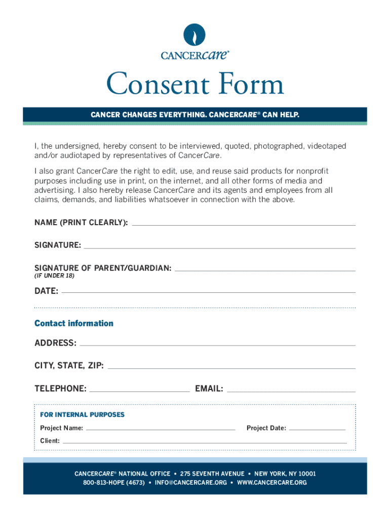 Consent Form Cancer changes everything. Cancercare can help.I, the undersigned, hereby consent to be interviewed, quoted, photographed, videotaped and/or audiotaped by representatives of CancerCare.
