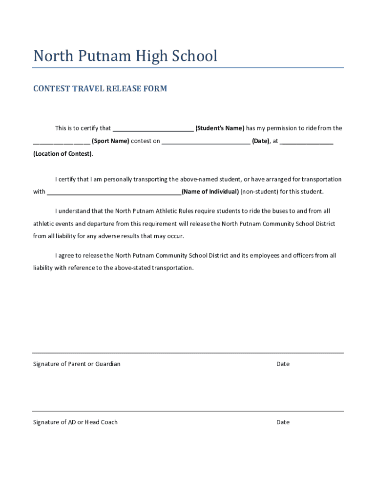 North Putnam High School CONTEST TRAVEL RELEASE FORMThis is to certify that(Students Name) has my permission to ride from the___ (Sport Name) contest on(Date), at ___(Location of Contest).I certify