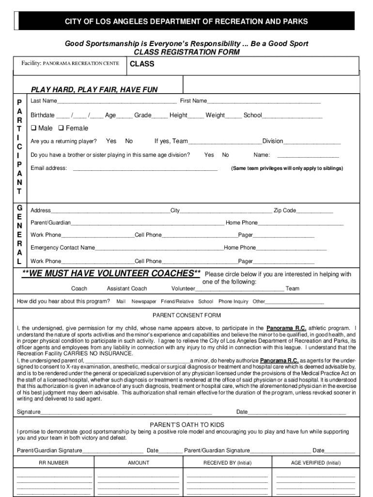 This form is used for registering participants in sports programs at the Panorama Recreation Center. It collects personal information, health consent, and volunteer preferences for parents and guardians.