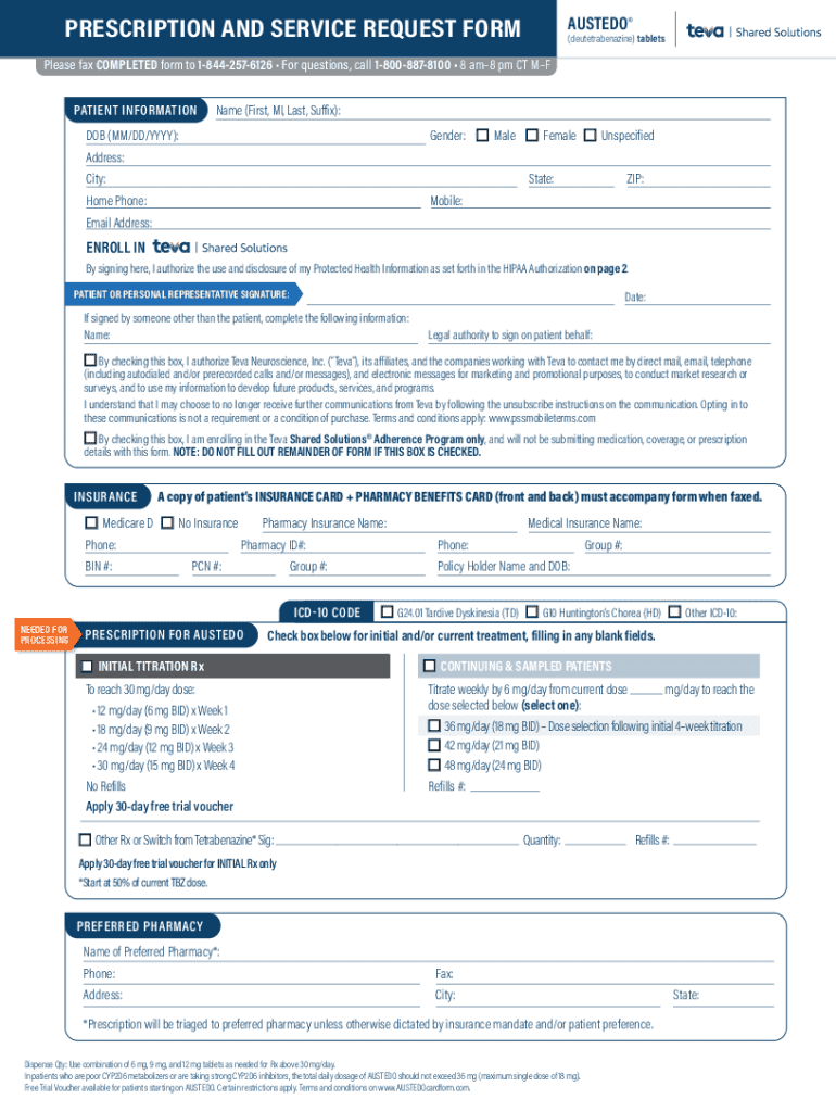 This form is used to request a prescription for AUSTEDO (deutetrabenazine) tablets, including patient and prescriber information, insurance details, and authorization for the use and disclosure of protected health information.