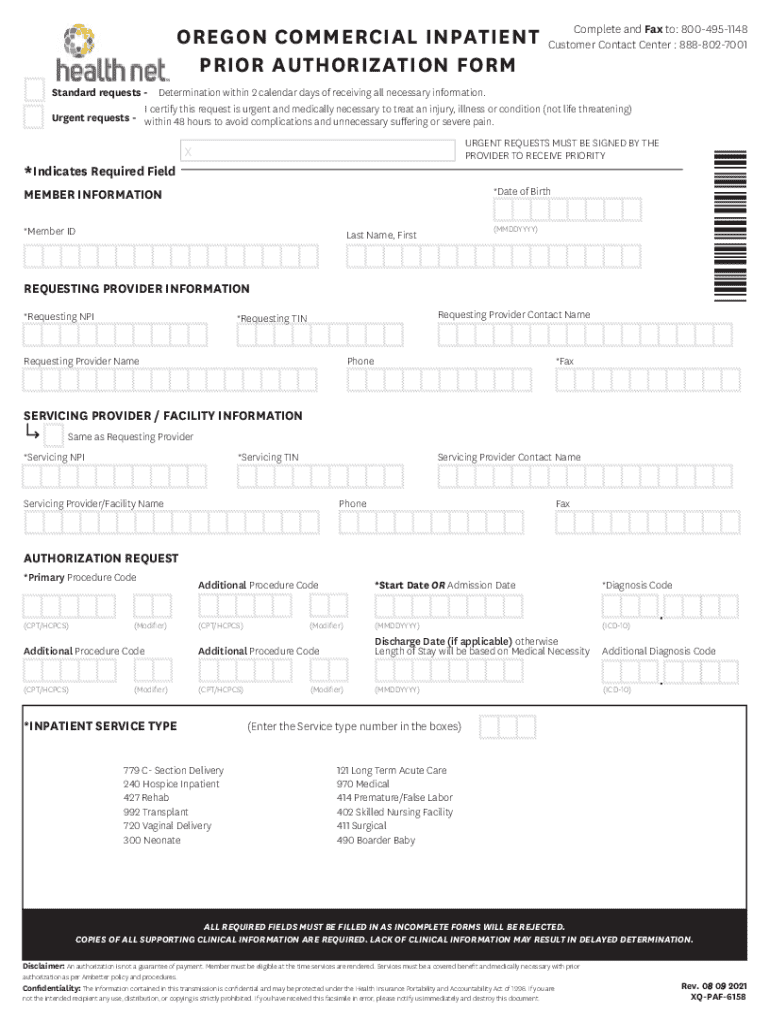 This form is used to request prior authorization for inpatient services in Oregon. It contains sections for member information, requesting provider details, servicing provider/facility information, and authorization request details, including procedure and diagnosis codes. The form emphasizes the urgency of requests and the necessity of completing all required fields to avoid rejection. It also outlines the confidentiality of the information provided and includes a disclaimer regarding...