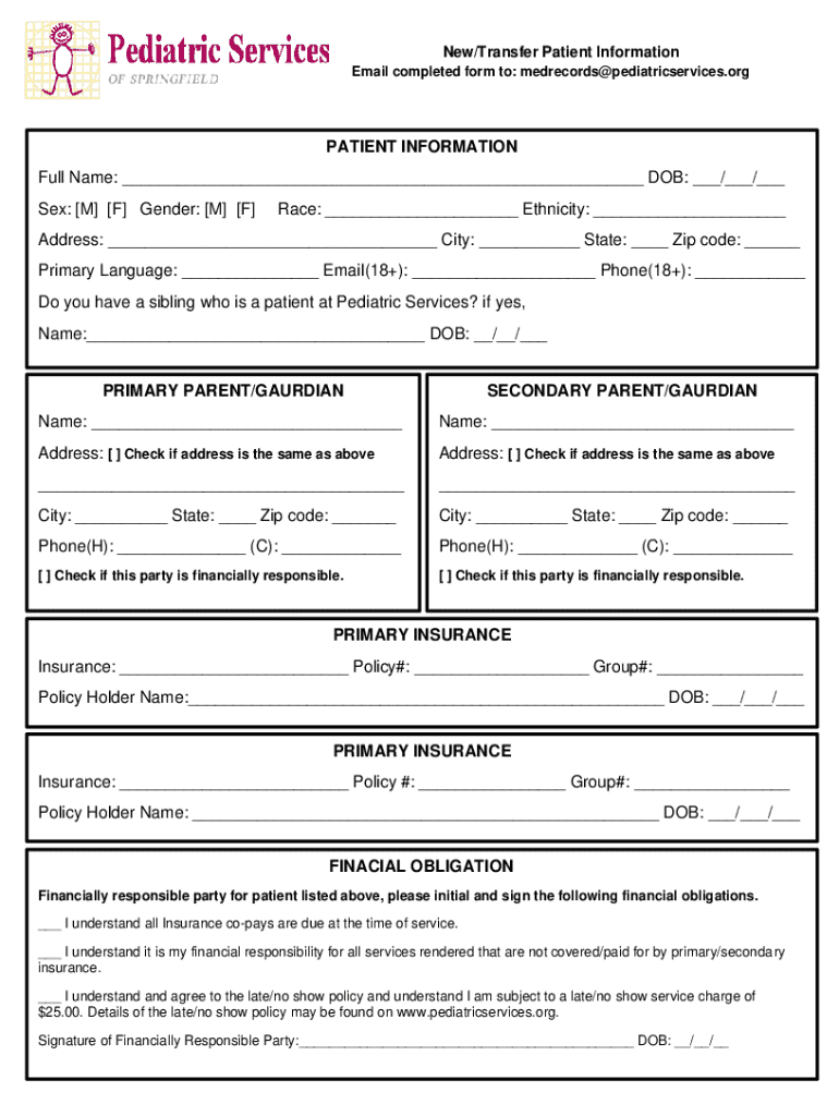 New/Transfer Patient Information Email completed form to: medrecords@pediatricservices.orgPATIENT INFORMATION Full Name: ___ DOB: ___/___/___ Sex: [M] [F] Gender: [M] [F]Race: ___ Ethnicity: ___Address:
