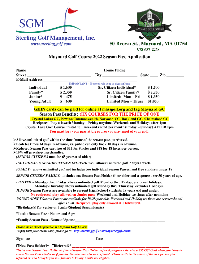 This document is an application form for obtaining a season pass at Maynard Golf Course for the year 2022. It includes various types of passes available, pricing, benefits, and specific details for different age categories, such as juniors and seniors. The form also outlines reciprocal play options, tee time booking policies, and discount offers.