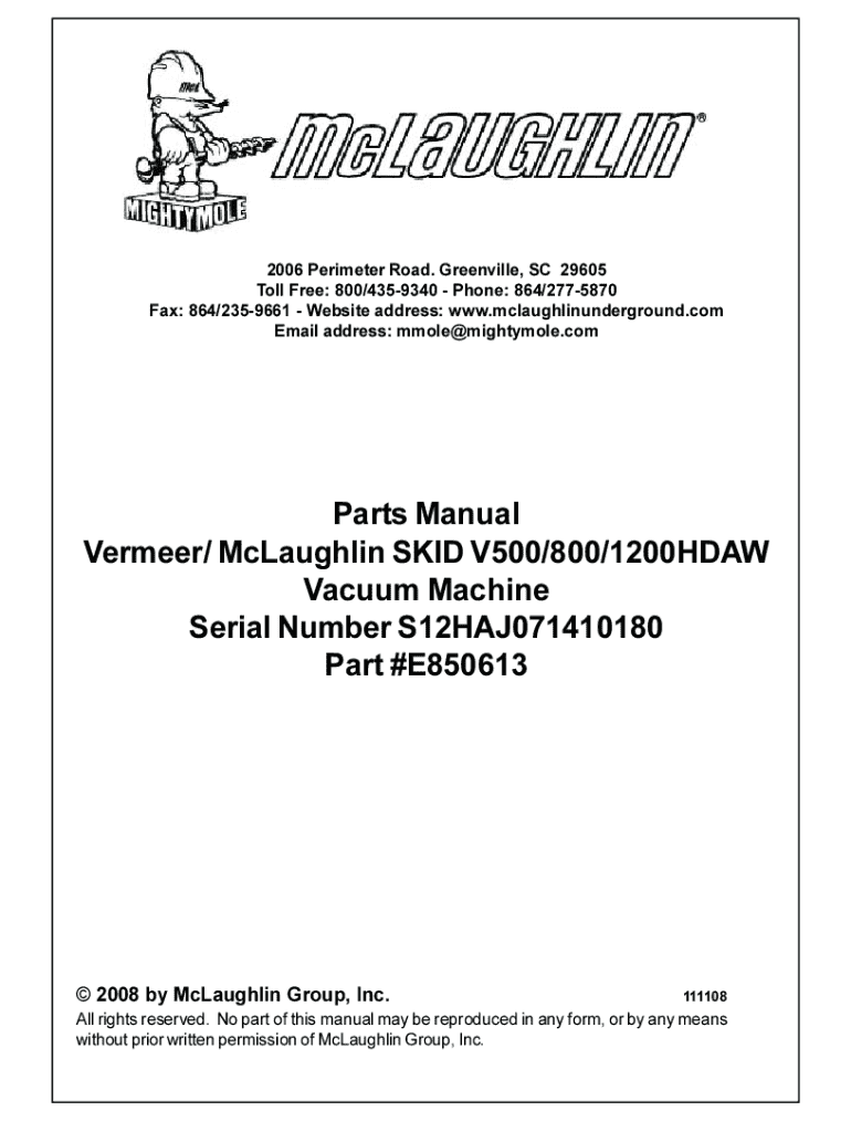 2006 Perimeter Road. Greenville, SC 29605 Toll Free: 800/4359340 Phone: 864/2775870 Fax: 864/2359661 Website address: www.mclaughlinunderground.com Email address: mmole@mightymole.comParts Manual