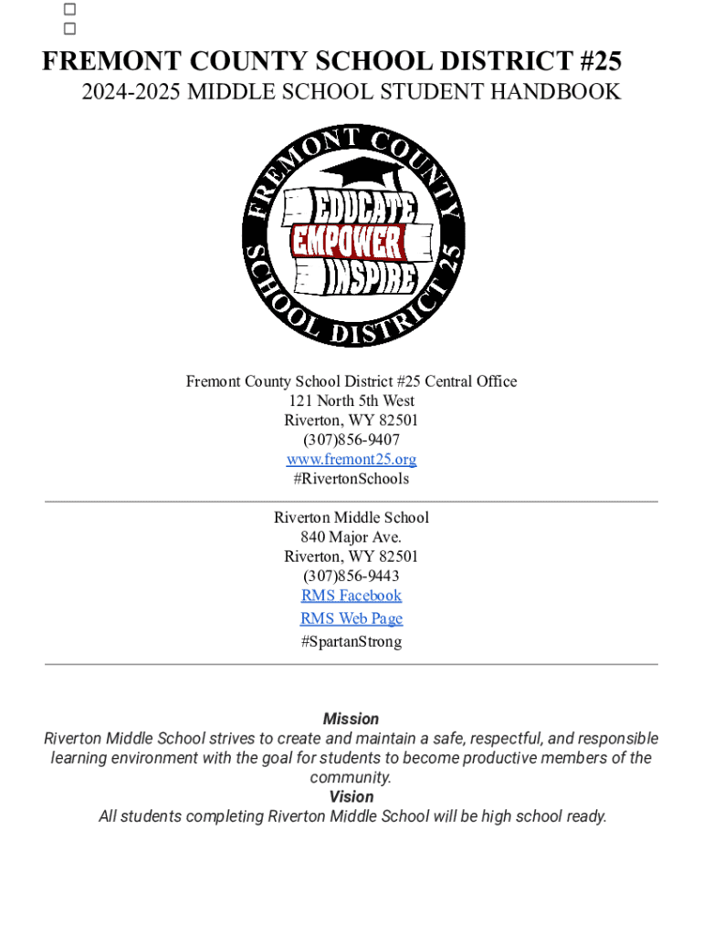 The Riverton Middle School Student Handbook outlines important policies, procedures, and expectations for students and parents for the 2024-2025 school year. It includes information on general school information, behavior expectations, attendance policies, academic requirements, safety guidelines, and available student services.