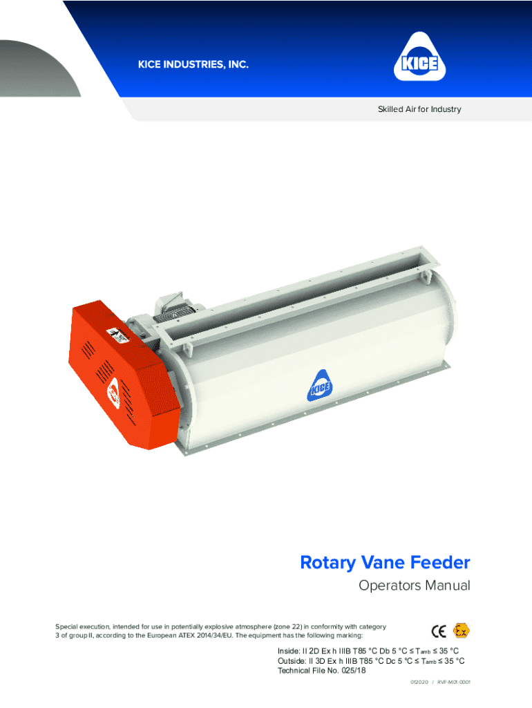 This manual provides comprehensive guidance for the installation, operation, maintenance, and safety precautions for the Kice Rotary Vane Feeder, specifically designed for use in potentially explosive atmospheres according to ATEX guidelines.