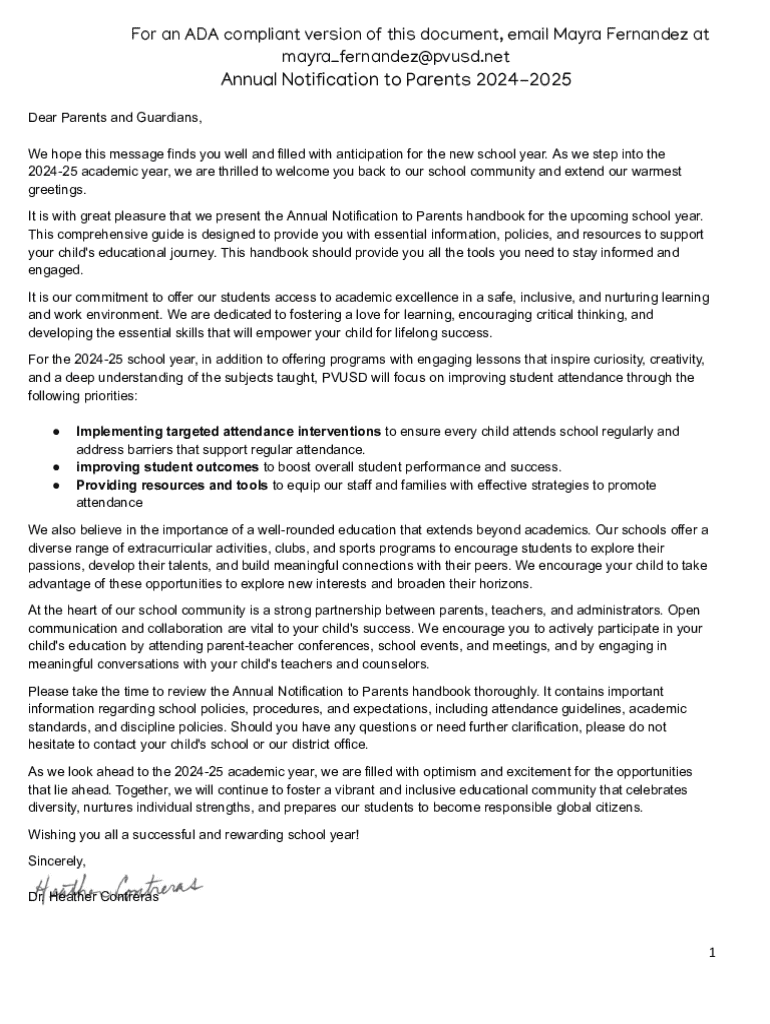 The Annual Notification to Parents handbook for the 2024-25 academic year provides essential information, policies, and resources to support students\' educational journeys. It emphasizes the importance of regular school attendance, the partnership between parents and educators, and includes details on attendance policies, student rights, and various programs offered by the Pajaro Valley Unified School District.