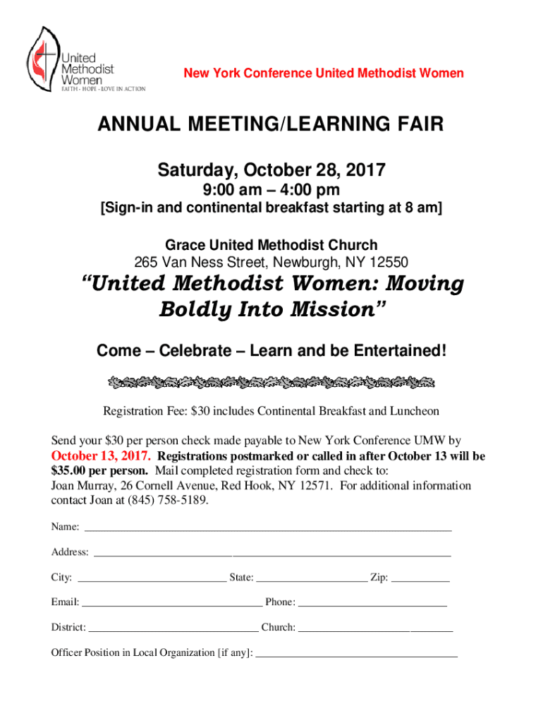New York Conference United Methodist WomenANNUAL MEETING/LEARNING FAIR Saturday, October 28, 2017 9:00 am 4:00 pm [Signin and continental breakfast starting at 8 am] Grace United Methodist Church