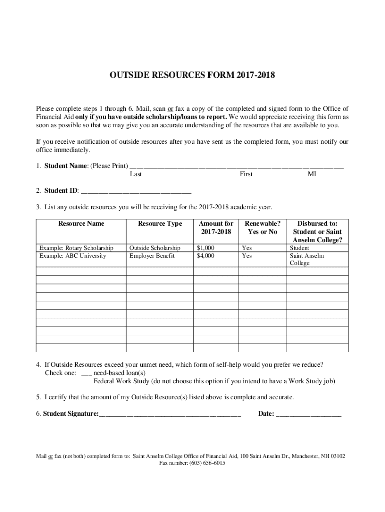This form is to be completed by students who have outside scholarships or loans to report for the academic year 2017-2018. It collects information on the student\'s name, ID, and details about the outside resources, including amounts, renewable status, and preferences for reducing self-help funds if necessary.