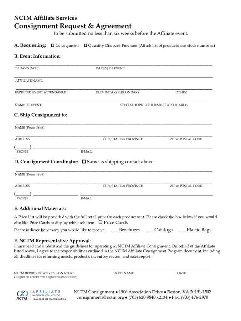 NCTM Affiliate ServicesConsignment Request & AgreementTo be submitted no less than six weeks before the Affiliate event.A. Requesting: Consignment Quantity Discount Purchase (Attach list of products
