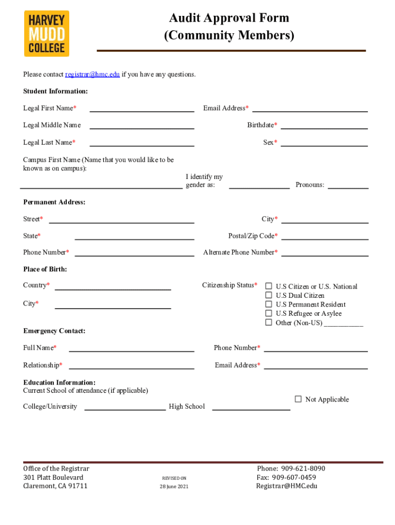 This form is intended for community members of Harvey Mudd College who wish to register as auditors for courses. The document details the necessary student information, education information, and outlines the policies and regulations related to auditing courses, including approvals, deadlines, grading, and the impact on academic credit.