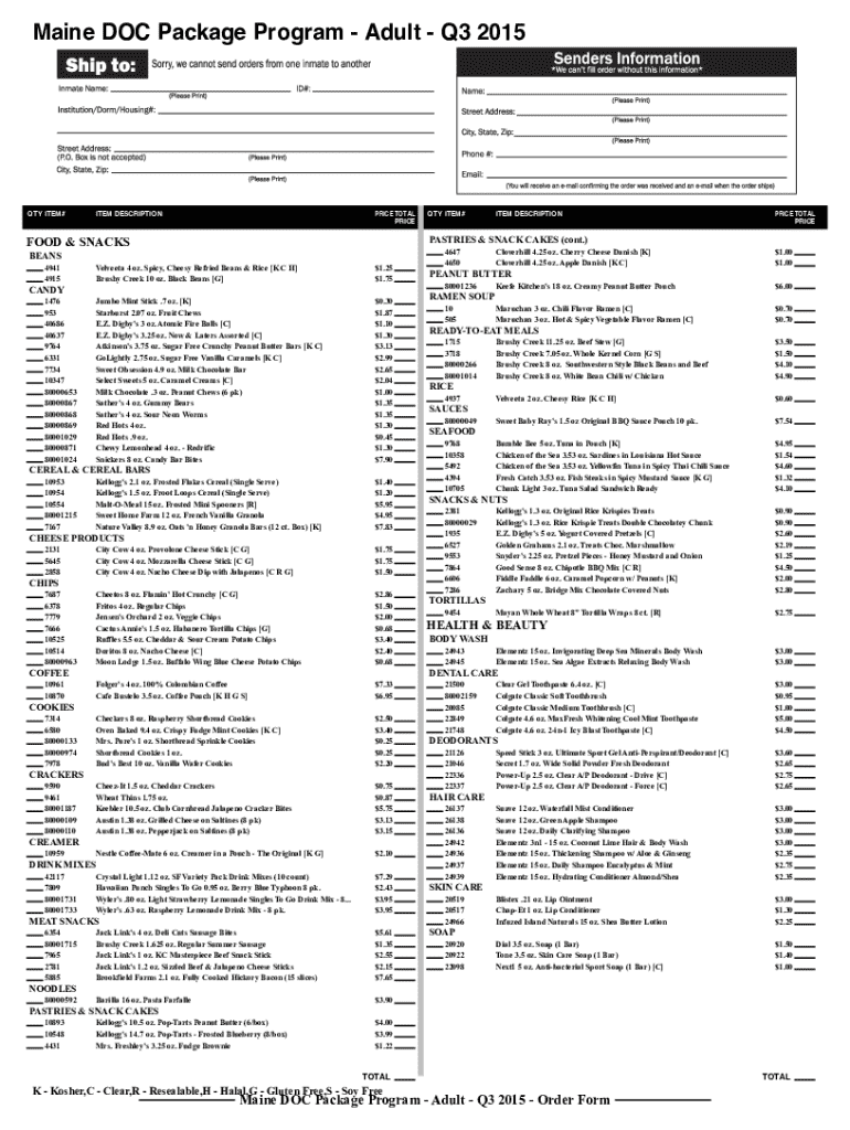 This document outlines the ordering process for the Maine Department of Corrections Package Program for adults for the third quarter of 2015. It includes a list of available food items, personal care products, payment methods, and shipping information for inmates.