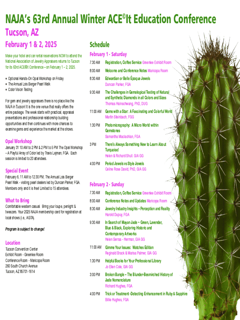 The NAJA\'s 63rd Annual Winter ACE©It Education Conference is a premier event for gem and jewelry appraisers, featuring a series of practical presentations, workshops, and networking opportunities. This conference will take place on February 1-2, 2025, in Tucson, AZ, and will cover various topics including gem appraisals, jewelry history, testing procedures, and market insights.