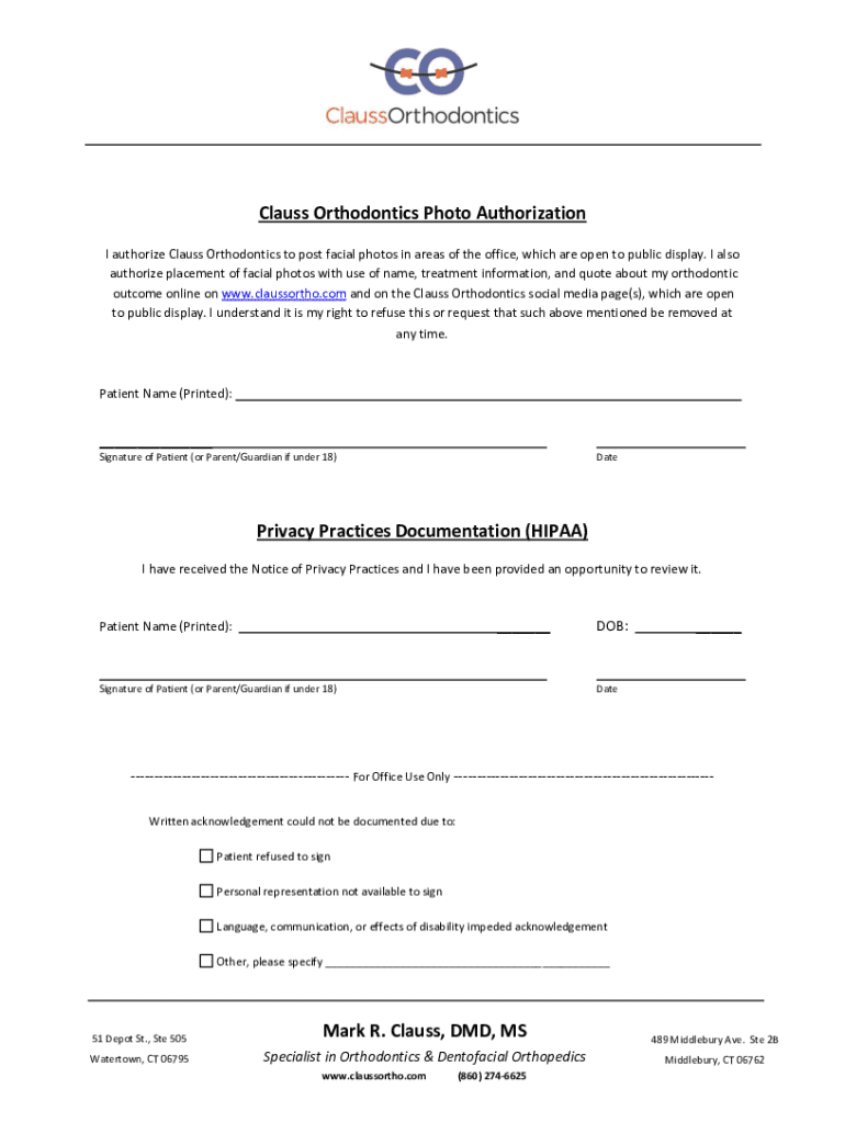 The Clauss Orthodontics photo authorization must include the patient’s name, date of birth, contact information, and the specific permissions granted for photo usage.
