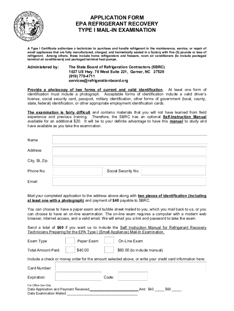 This application form is for technicians seeking a Type I Certificate which authorizes them to purchase and handle refrigerant in small appliances. It includes instructions for completing the exam application, identification requirements, payment details, and options for preparing for the examination.