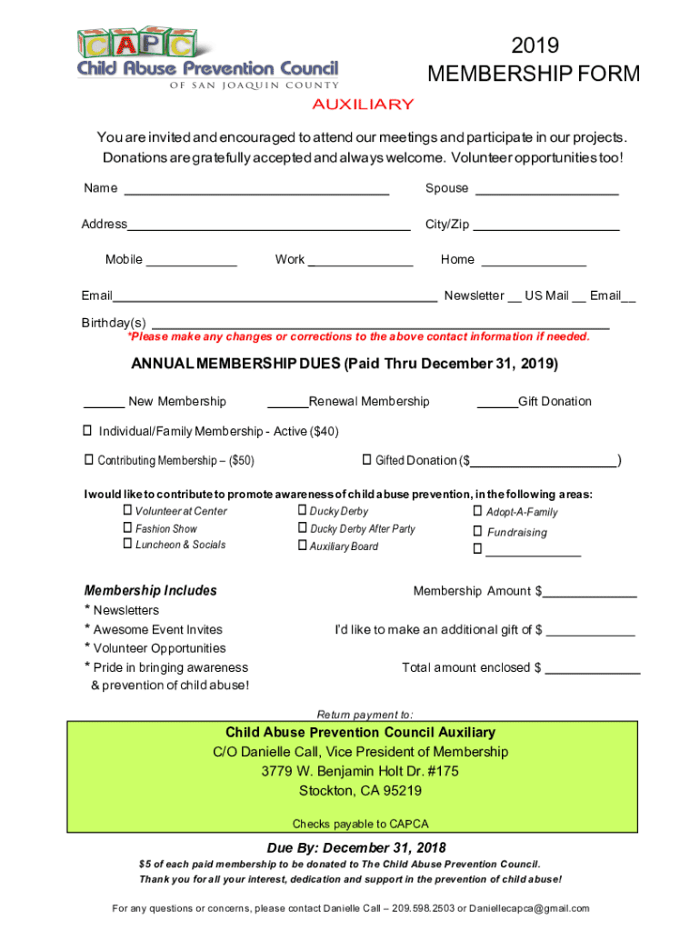 This document serves as a membership application for the Auxiliary of the Child Abuse Prevention Council. It provides details on how to join, the dues for new and renewing members, and opportunities for volunteering and donations to support child abuse prevention initiatives.