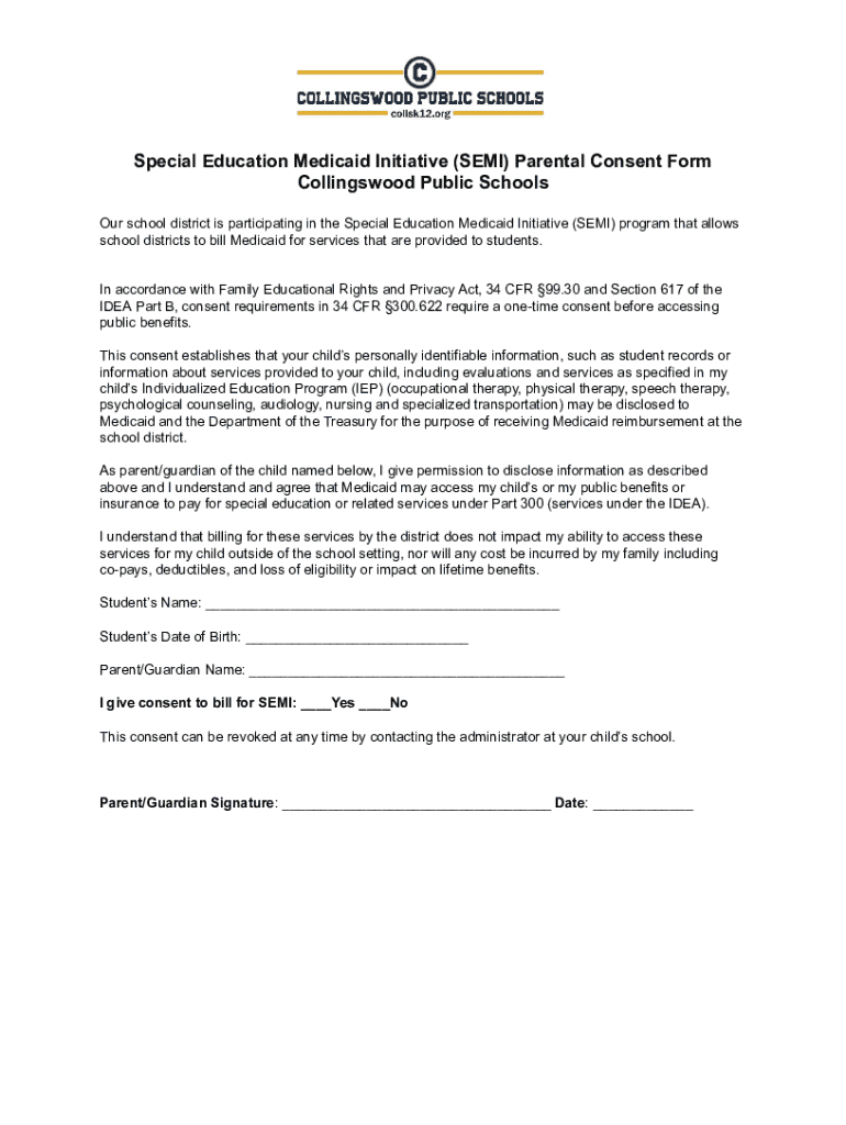 This form is designed for parents or guardians of students enrolled in the Special Education Medicaid Initiative (SEMI) program. It seeks consent for the disclosure of personally identifiable information to access Medicaid benefits for various special education services provided at school, ensuring compliance with applicable federal privacy regulations.