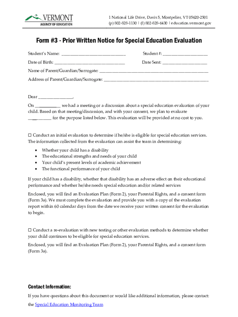 1 National Life Drive, Davis 5, Montpelier, VT 056202501 (p) 8028281130 | (f) 8028286430 | education.vermont.govForm #3 Prior Written Notice for Special Education Evaluation Students Name: ___Student