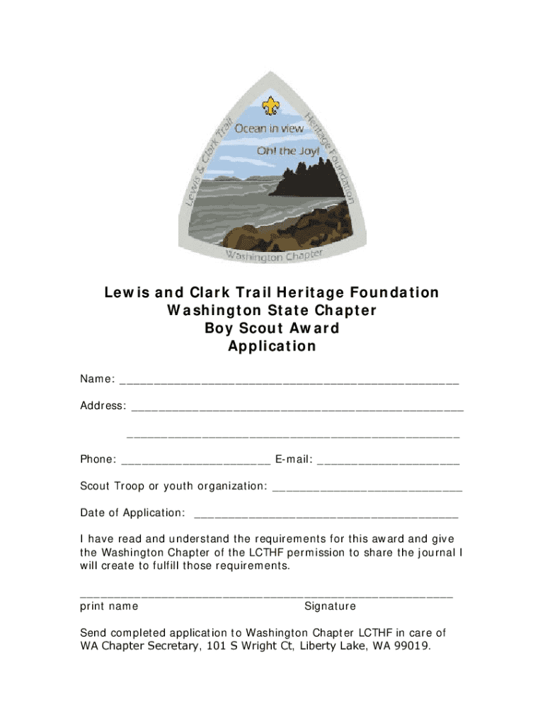 This document is an application form for the Boy Scout Award offered by the Washington State Chapter of the Lewis and Clark Trail Heritage Foundation. It collects personal information from the applicant and confirms their understanding of the award requirements.
