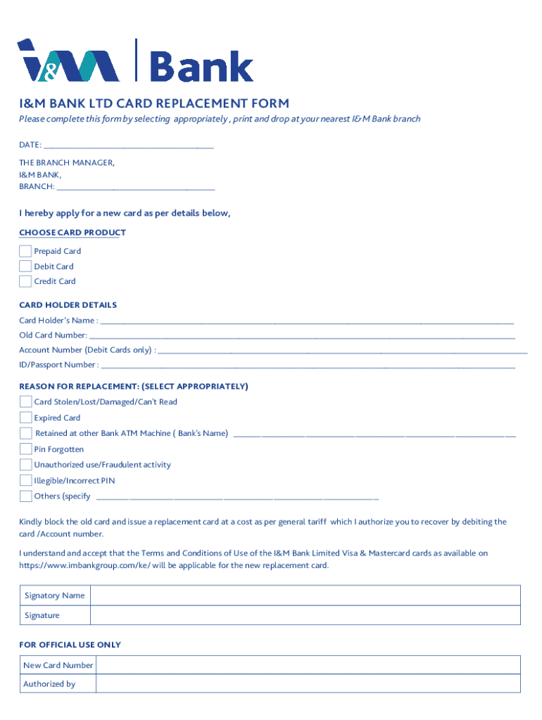 I&M BANK LTD CARD REPLACEMENT FORM Please complete this form by selecting appropriately , print and drop at your nearest I&M Bank branch DATE: ___ THE BRANCH MANAGER, I&M BANK, BRANCH: ___I hereby