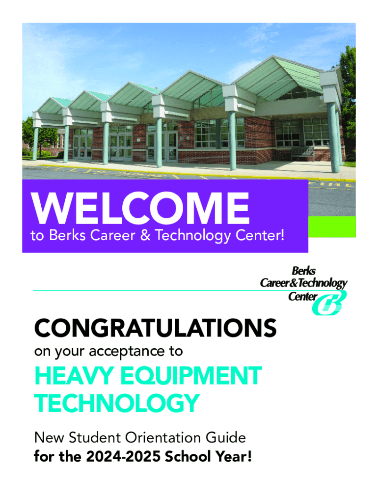 WELCOMEto Berks Career & Technology Center!CONGRATULATIONS on your acceptance toHEAVY EQUIPMENT TECHNOLOGY New Student Orientation Guide for the 20242025 School Year!HEAVY EQUIPMENT TECHNOLOGY East