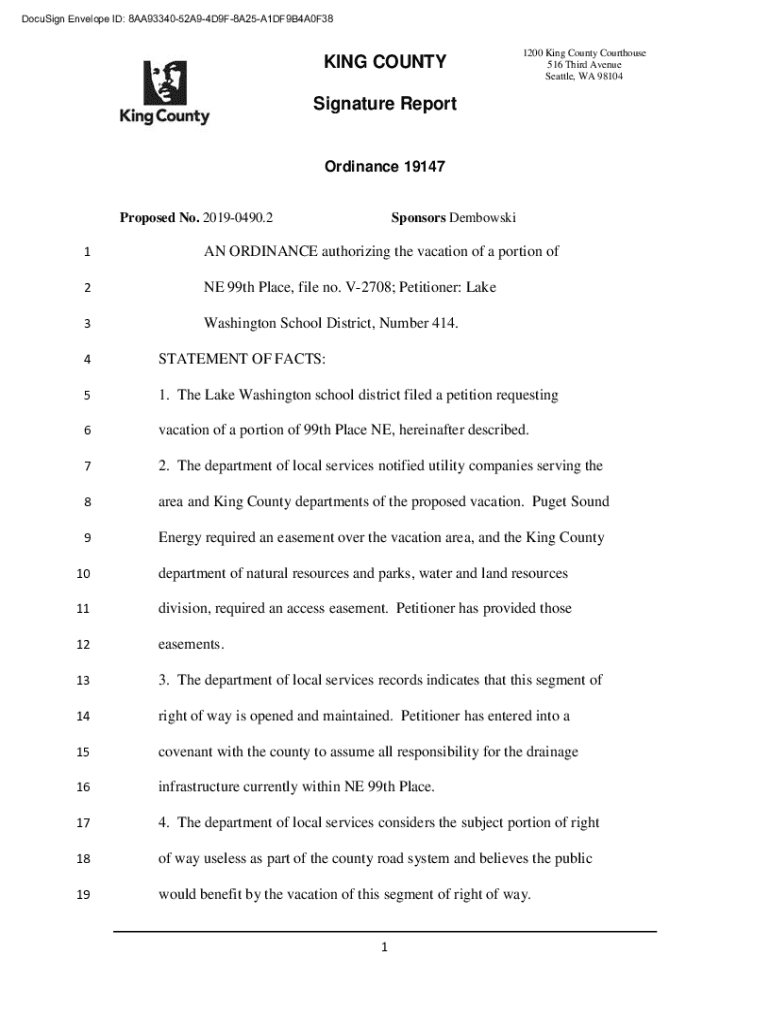 This document details the ordinance passed by the King County Council that authorizes the vacation of a portion of NE 99th Place in relation to a petition by the Lake Washington School District. The vacation is deemed beneficial to the public, with a focus on managing access for school purposes without requiring compensation.