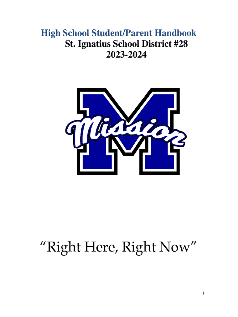 The Student/Parent Handbook for St. Ignatius School District #28 provides essential information regarding school policies, procedures, and guidelines for the 2023-2024 academic year. It covers topics such as enrollment requirements, student rights, internet use, attendance policy, academic standards, graduation requirements, discipline policies, and extracurricular activities. The handbook aims to ensure a safe and productive learning environment for all students and parents in the district.