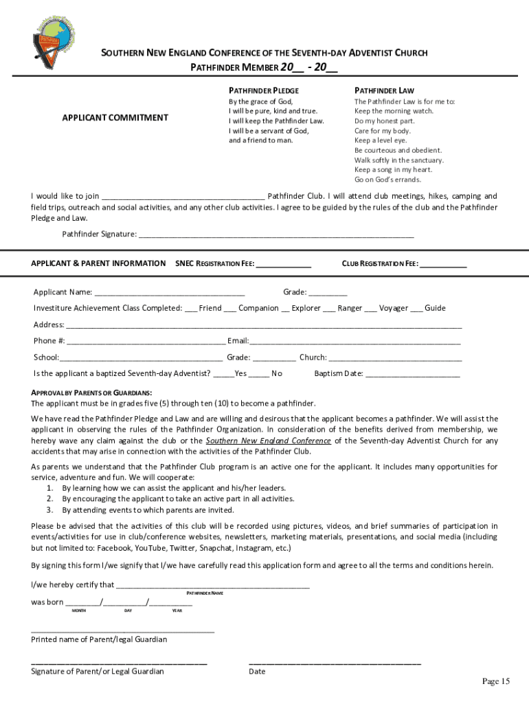This document serves as an application for potential members of the Pathfinder Club within the Southern New England Conference of the Seventh-day Adventist Church. It outlines the commitment to the Pathfinder Pledge and Law, seeks parent/guardian consent, and gathers health history and emergency contact information for applicants aged five to ten. The document ensures compliance with club activities, health considerations, and includes necessary consent for medical treatment during club events.